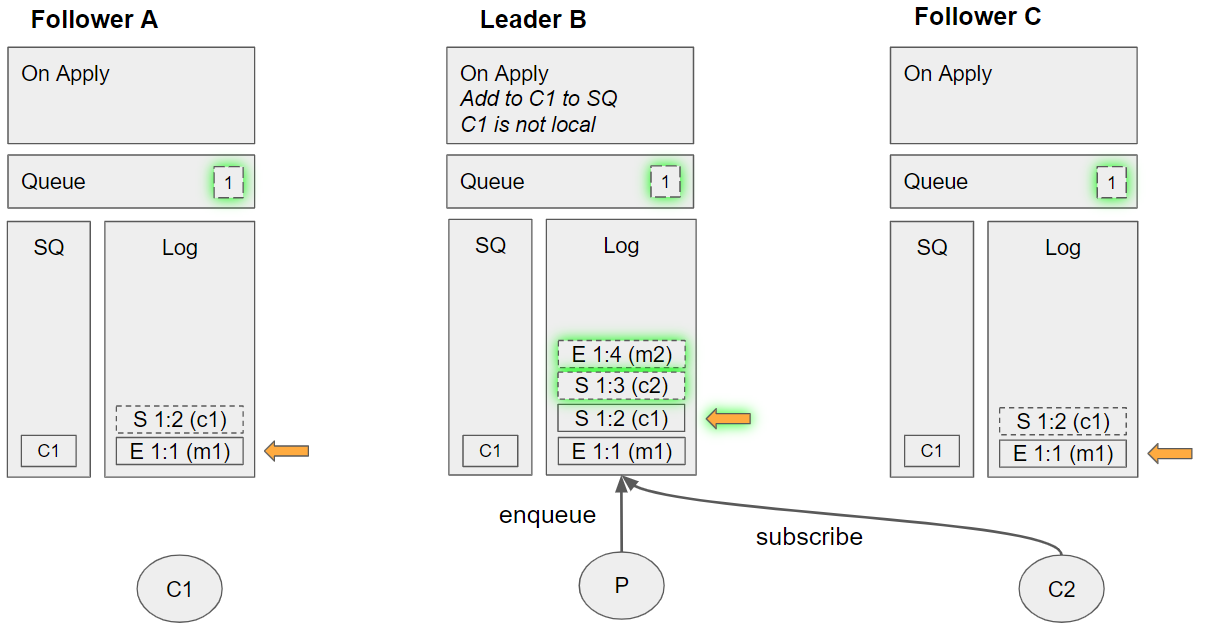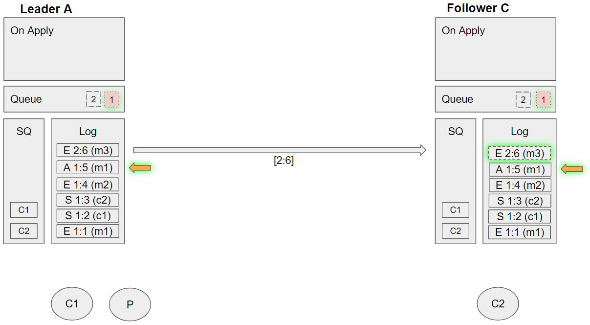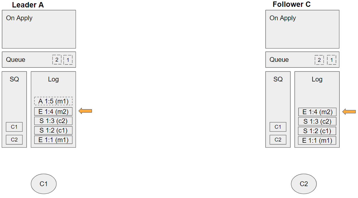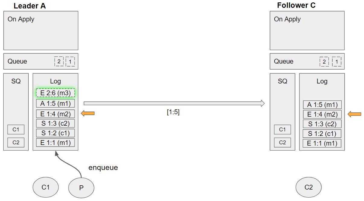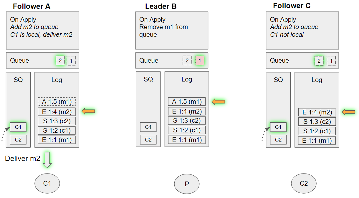 1. Removes the message from its queue *Follower C applies the enqueue m2 command: